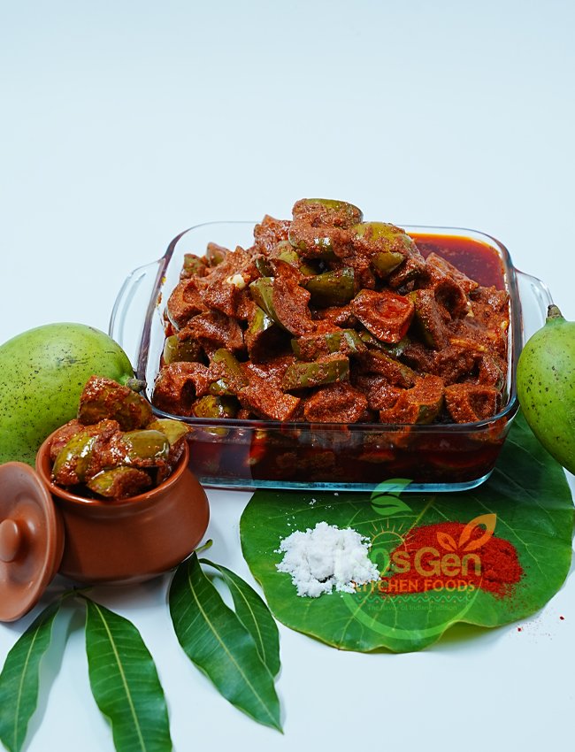 Authentic Mango Aavakaya with garlic, packed with bold spices and tangy raw mango flavor.